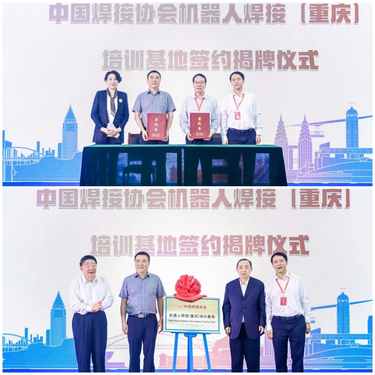 会议现场,吴九澎副秘书长与张文礼董事长分别代表中国焊接协会与重庆交通职业学院就中国焊接协会机器人焊接(重庆)培训基地进行合作签约,杨志明副部长,王佐书会长,李连胜秘书长、张文礼董事长共同为中国焊接协会机器人焊接(重庆)培训基地揭牌。