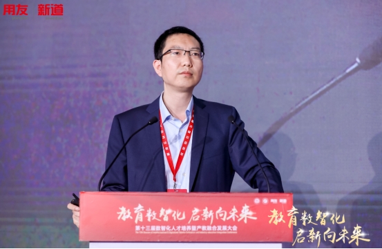 西安电子科技大学副校长王泉以“‘六新’推动高等教育的数字化转型”为题进行分享。他表示,信息技术发展为教育数字化转型提供了技术支撑。西安电子科技大学建设人工智能+教育标杆校的优势,以数字化转型重构人才培养的体系,以“六新”建设推动教育数字化转型。随后,他详细介绍了处处能学、时时可学的育人“新环境”,类型重构和供给方式重构的“新资源”,基于信息技术和智能技术的“新教学”,大数据支撑下的教育教学“新评价”,人机结合、人技结合的能力“新培训”,基于数据驱动的高校智治体系“新治理”的“六新”内容和举措。王泉表示,西安电子科技大学与新道科技进行了一系列合作,未来也期待双方能继续深化产学研合作,推动高等教育发展。
