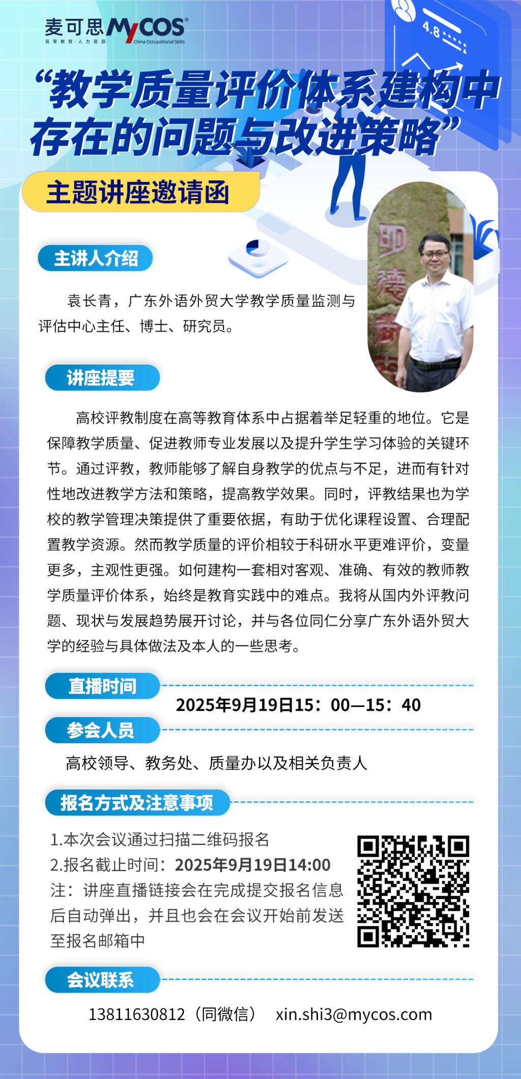 ◉时间:9月19日(星期五)15:00——15:40◉主讲人:袁长青(广东外语外贸大学教学质量监测与评估中心主任)◉报告主题:“教学质量评价体系建构中存在的问题与改进策略”◉报告提要:如何建构一套相对客观、准确、有效的教师教学质量评价体系,始终是教育实践中的难点。袁主任将从国内外评教问题、现状与发展趋势展开讨论,并与各位同仁分享广东外语外贸大学的经验与具体做法及个人的一些思考。