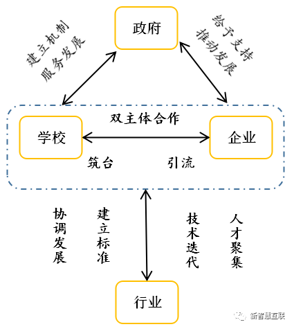 产学合作中企业与高校合作的领域是全方面的,“不仅体现在实习环节,而且体现在教育和教学的所有环节,包括培养目标、课程设置、教材编撰、师资建设、实践训练、专业评估等众多方面”。政府在产学合作中具有重要作用,能在很大程度上推动产学合作。所以,在产学合作的过程中,其主体也应该包括政府,引导产学合作向更高层面发展,即“政产学研”。相对于“产学合作”“产学研合作”,“政产学研”更强调政府主体作用的发挥。
